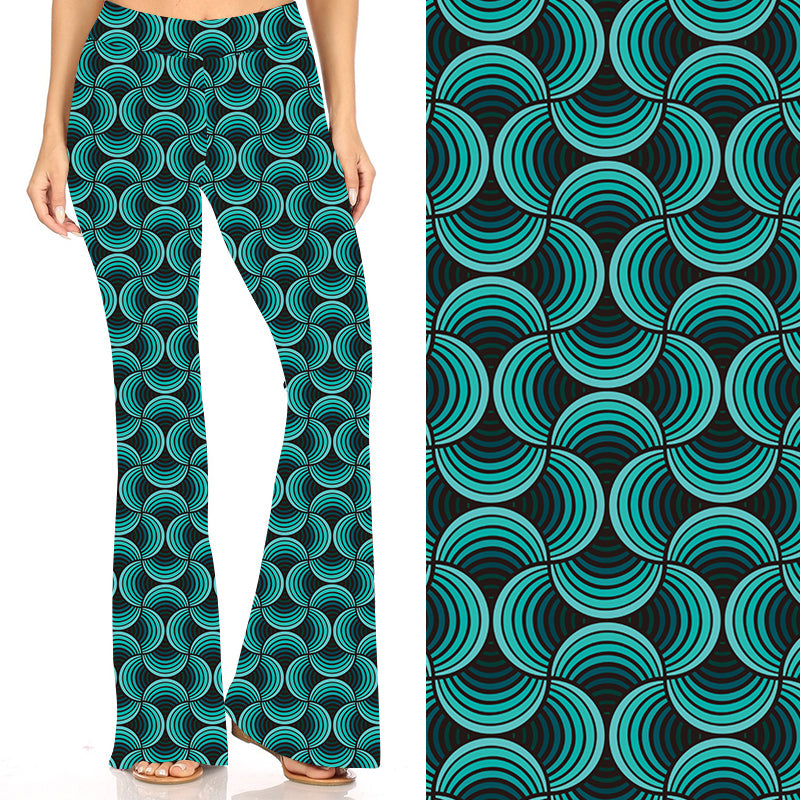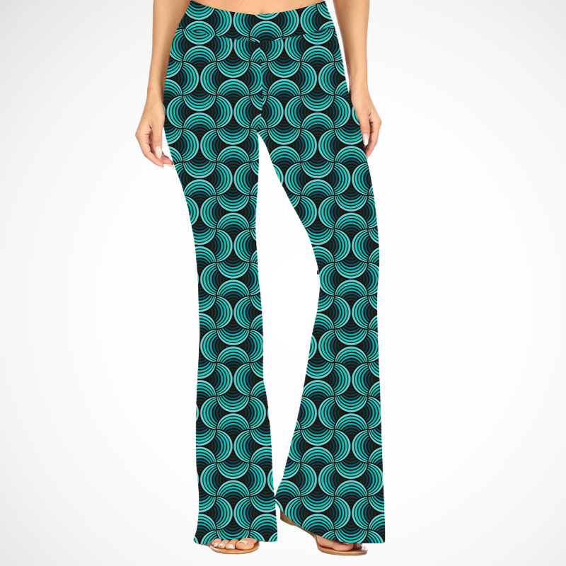 Step into the hypnotic rhythm of teal swirls with these bold bell bottoms. Comfort meets retro chic—your legs deserve this spotlight!
