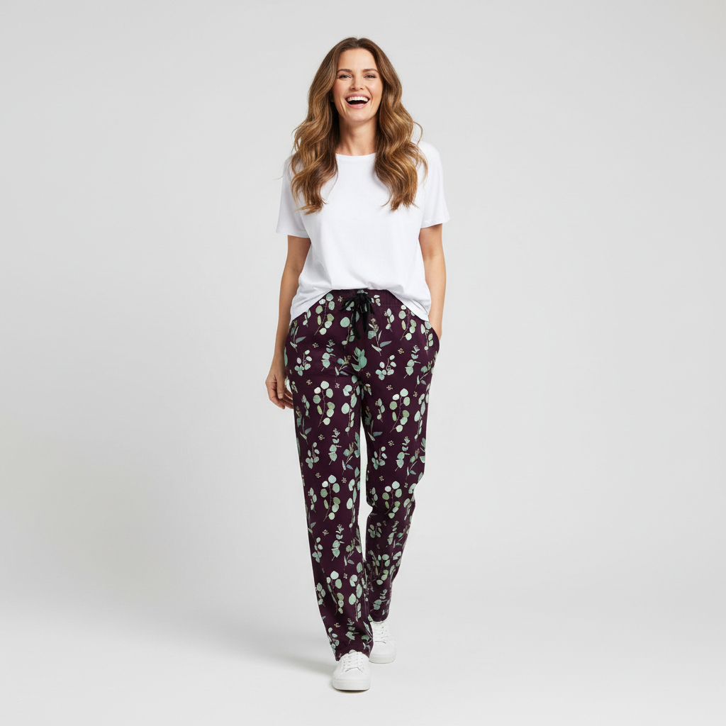 Relax in effortless style with these buttery-soft eucalyptus print lounge pants, featuring calming sage leaves on a rich plum base. Designed with a comfy elastic waist and easy relaxed fit, they’re perfect for lounging, travelling, or everyday wear with that signature Natopia comfort. 🌿💜
